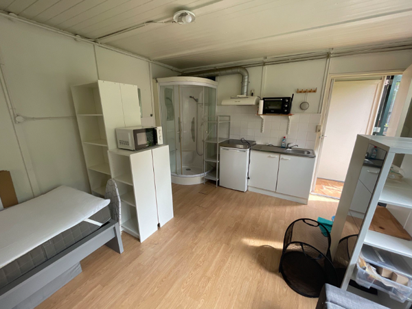 Zimmer 14 befindet sich an der Rückseite des Gebäudes und hat eine Fläche von 18,38 m². Der Raum ist mit einer eigenen Küche ausgestattet, die alle notwendigen Annehmlichkeiten bietet, sowie einer eigenen Duschkabine, sodass diese nicht geteilt werden muss. Darüber hinaus gibt es eine gemeinsame Toilette, die Sie sich mit einem Mitbewohner teilen. Schließlich gibt es einen geräumigen Garten, in dem Sie Ihr Fahrrad sicher abstellen können.