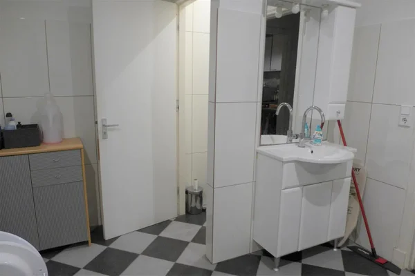 Zimmer im zweiten Stock hinten in einem Studentenwohnheim mit Waschbecken, gemeinschaftlicher Küche, Toilette und Bad mit Dusche und Waschbecken.