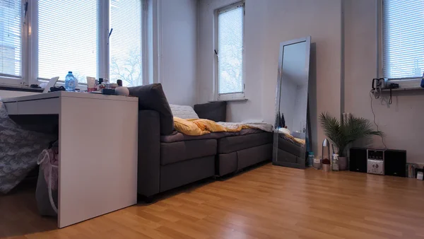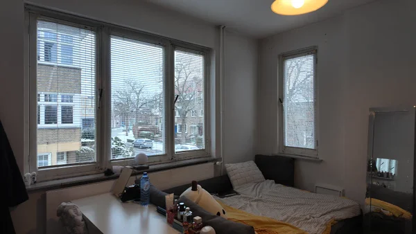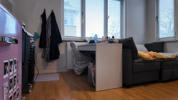 Zimmer 5 mit eigenem Waschbecken im ersten Stock links vorne gelegen. Mit 10 anderen Studenten werden 2 Küchen, 2 Toiletten, Badezimmer, Keller mit Waschküche und Vorgarten mit Fahrradabstellraum und kleinem Hintergarten geteilt.
