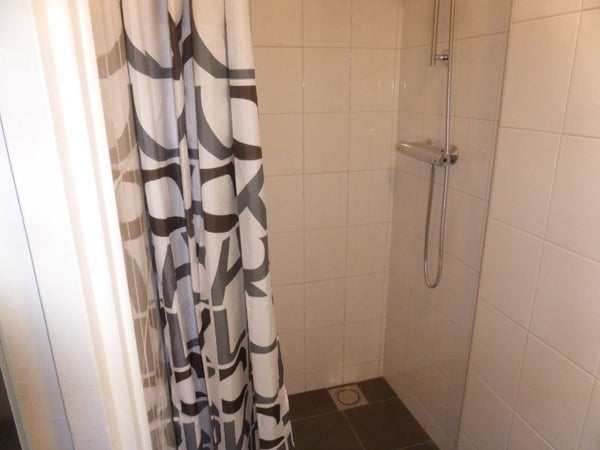 Das Badezimmer ist mit einer großen begehbaren Dusche und einer Waschmaschine (zur gemeinschaftlichen Nutzung) ausgestattet.